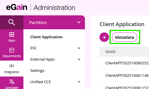 Departmentdropdown →Partition→Integration→Client Applicationthen click the (+) Plus button to create a new application..