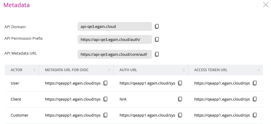- Meta URL: The URL for your eGain instance where this metadata can be accessed.